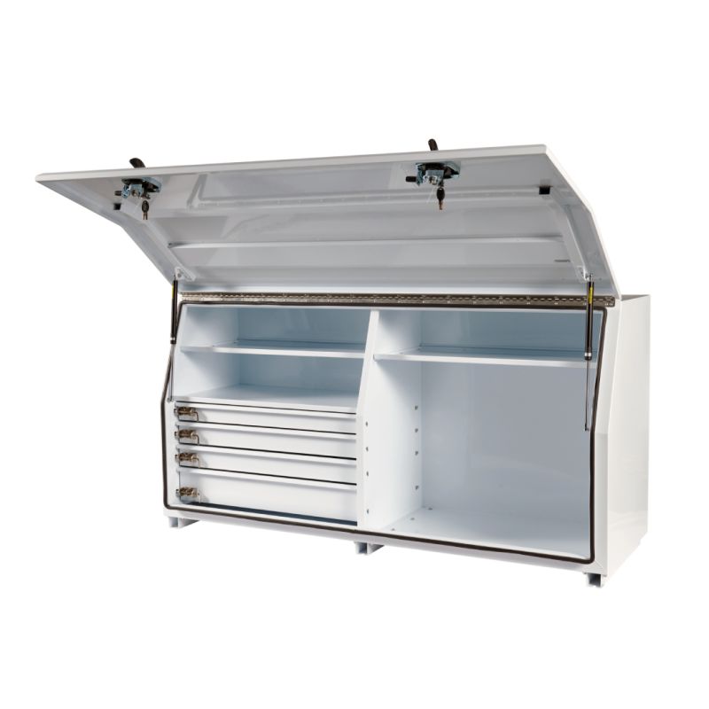 These particular mine toolboxes come with 4 x half-length drawers with heavy duty drawer slides and 2 x half-length internal shelves for storage of small tools and parts.